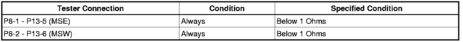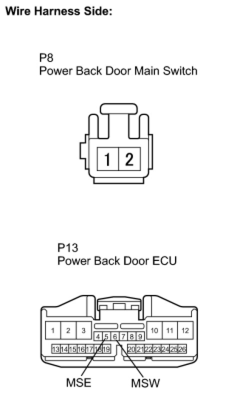The power back door ECU applies voltage to the power back door main switch via terminal MSW. When the switch is on (there is continuity between the switch terminals), a power back door operation cancel request signal is input to the power back door ECU.