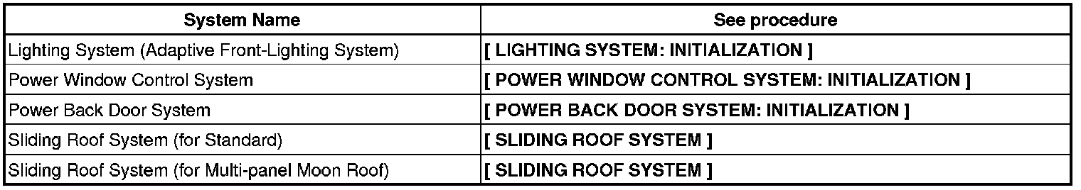 When disconnecting the cable from the negative battery terminal, initialize the following systems after the cable is reconnected.