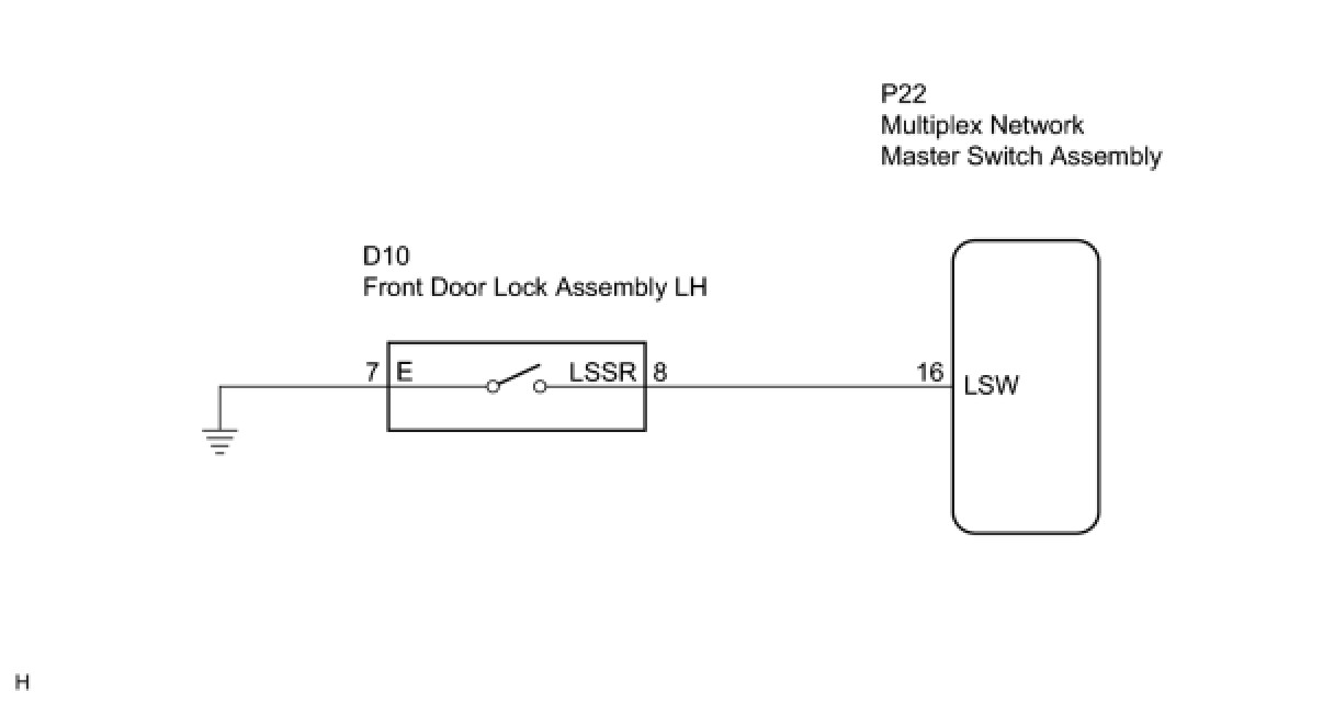 The multiplex network master switch assembly applies voltage to the door unlock detection switch via terminal LSW. When the door unlock detection switch is on (there is continuity between the switch terminals), a lock state signal is input to the multiplex network master switch assembly. When the switch is off (there is no continuity between the switch terminals), an unlock state signal is input.