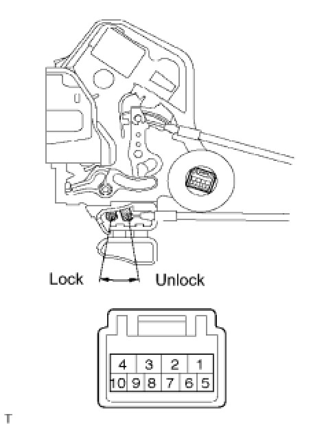 The body ECU applies voltage to the door unlock detection switch via terminal LSWL. When the door unlock detection switch is on (there is continuity between the switch terminals), a lock state signal is input to the ECU. When the switch is off (there is no continuity between the switch terminals), an unlock state signal is input.