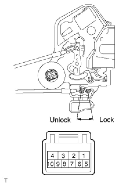 The body ECU applies voltage to the door unlock detection switch via terminal LSWR. When the door unlock detection switch is on (there is continuity between the switch terminals), a lock state signal is input to the ECU. When the switch is off (there is no continuity between the switch terminals), an unlock state signal is input.