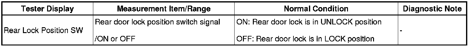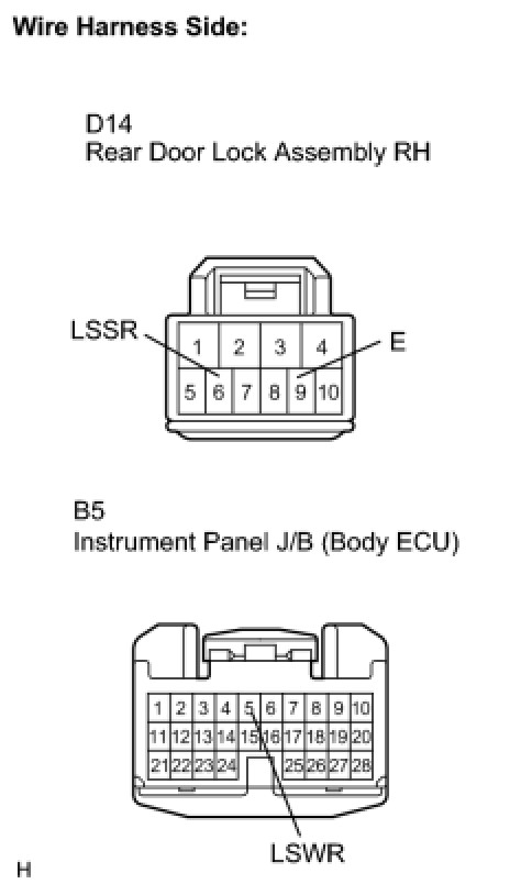 The body ECU is connected to the rear left side door lock assembly via terminal LSWR and rear left side door lock/unlock state signals are input to the ECU.