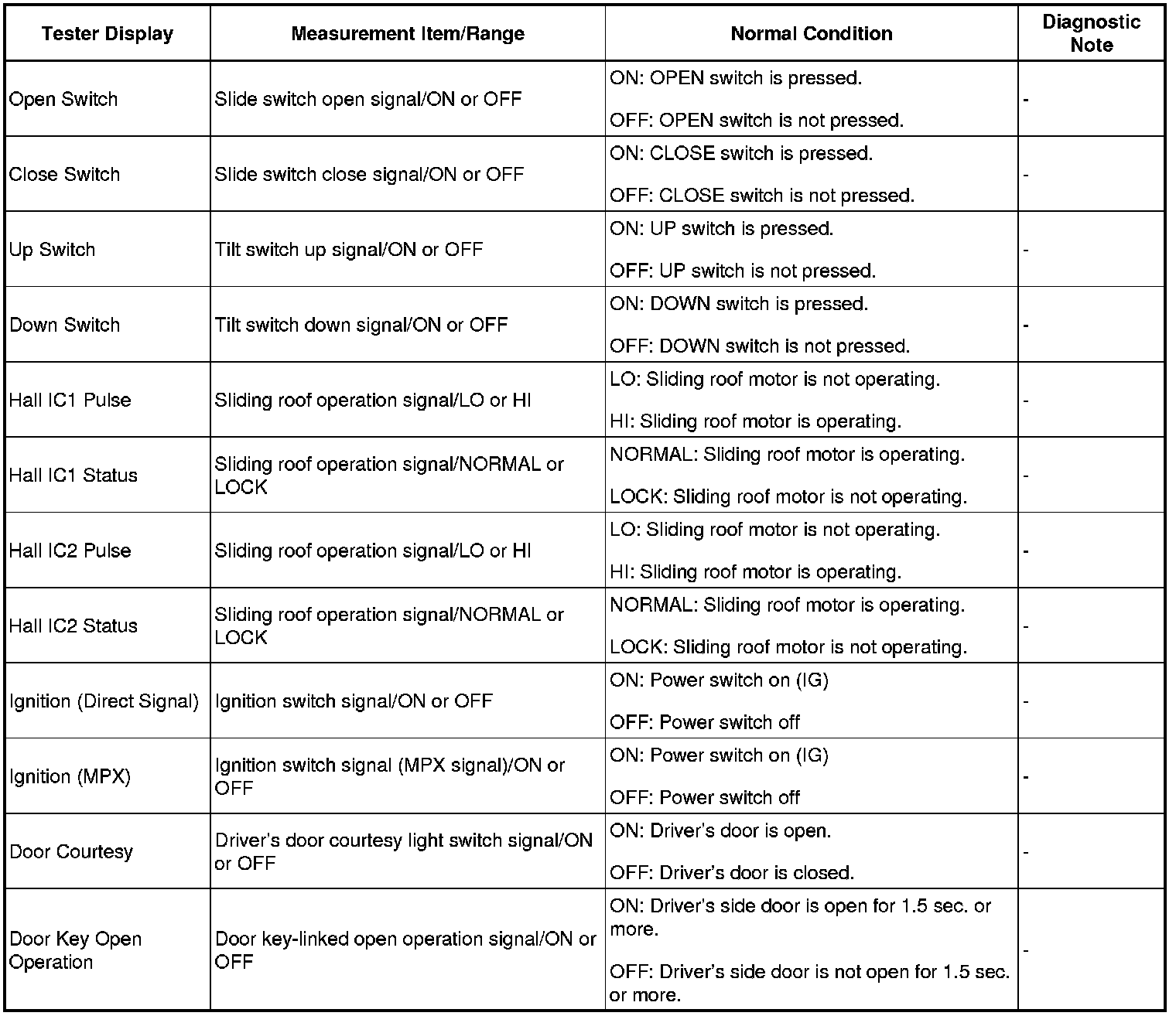 SLIDING ROOF: SLIDING ROOF SYSTEM (for Multi-panel Moon Roof): DATA LIST / ACTIVE TEST