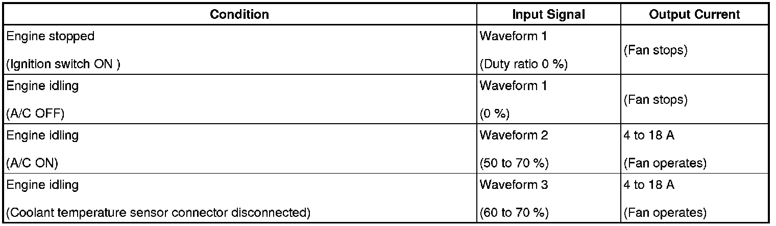 - If the output current is abnormal even when the input signal is normal, there is a malfunction in the cooling fan ECU (RFC) or motor.