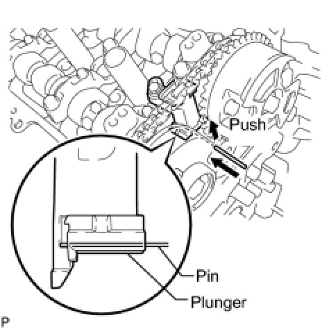 (a) While pushing down the No. 3 chain tensioner, insert a pin of dia 1.0 mm (0.039 in.) into the hole to fix the No. 3 chain tensioner.