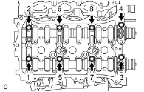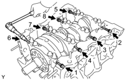 (b) Uniformly loosen and remove the 8 bearing cap bolts in the sequence shown in the illustration.