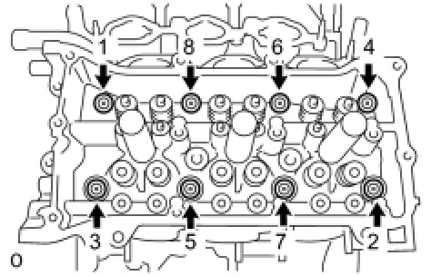 (a) Uniformly loosen and remove the 8 main bearing cap bolts and seal washers in several steps and in the sequence shown in the illustration.