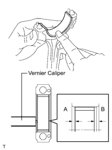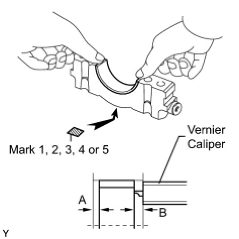 (2) Using a vernier caliper, measure the distance between the bearing cap's edge and the lower bearing's edge.