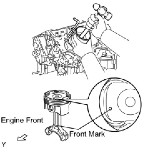 (c) Using a piston ring compressor, push the correctly numbered piston and connecting rod assembly into the cylinder with the front mark of the piston facing forward.