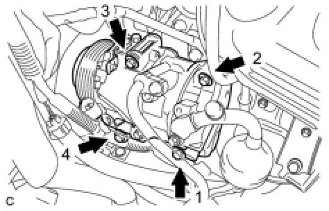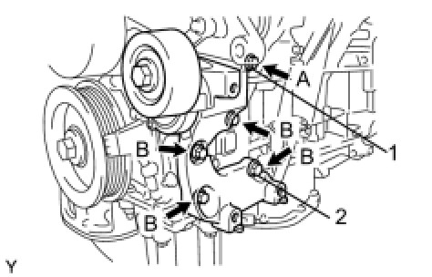 (b) Install the V-ribbed belt tensioner by tightening the bolt 1 and bolt 2 in the order shown in the illustration.