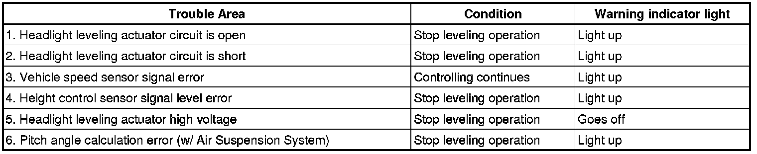 HINT: The Headlight Leveling Control ECU performs fail-safe when detecting the following troubles.