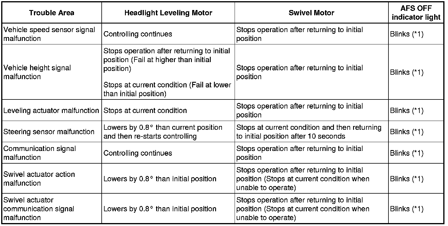 HINT: The Headlight Swivel ECU performs fail-safe when detecting the following troubles. The AFS OFF indicator light on the combination meter comes on at the same time.