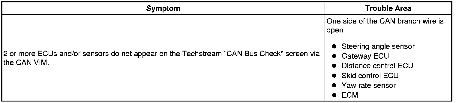 HINT: If some ECUs and sensors repeatedly appear and disappear from the "CAN Bus Check" screen, communication between the normal ECUs (sensors) and Techstream may be affected by the incomplete signals that are output from the ECU that has an open circuit in either of its CAN branch wires. In this case, the CAN branch wires for the ECUs and sensors that repeatedly appear and disappear from the screen are normal and the ECU that is not displayed on the screen may be the main cause of the problem (this ECU may have an open circuit in either of its CAN branch wires).