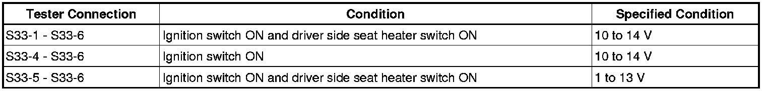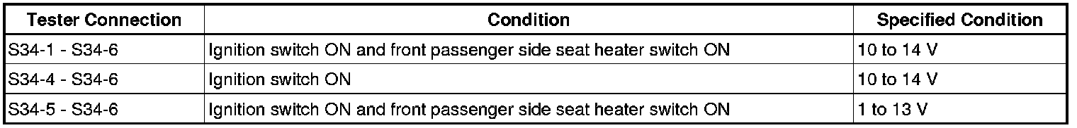 If the result is not as specified, repair or replace the seat heater switch circuit.