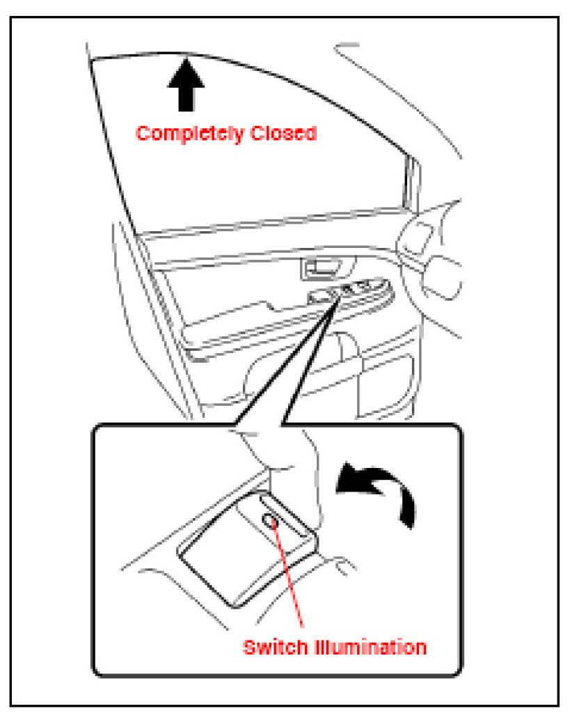 4. Pull up the driver's door power window switch until the window closes, and continue to hold it up for more than one second.
