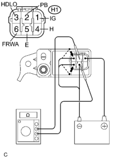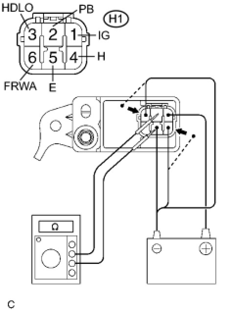 (5) Connect the negative (-) lead of the battery to the terminal H1-3 (HDLO) and the terminal H1-6 (FRWA), and check that continuity exists between the terminal H1-2 (PB) and the terminal H1-5 (E) for 0.8 to 0.9 seconds, then no continuity exists.