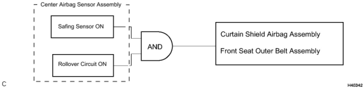 (d) The vehicle is equipped with the function to activate the SRS in case of vehicle rollover. A circuit to detect vehicle rollover is built into the center airbag sensor assembly. When the conditions for vehicle rollover are met, the SRS is activated as shown in the illustration below.