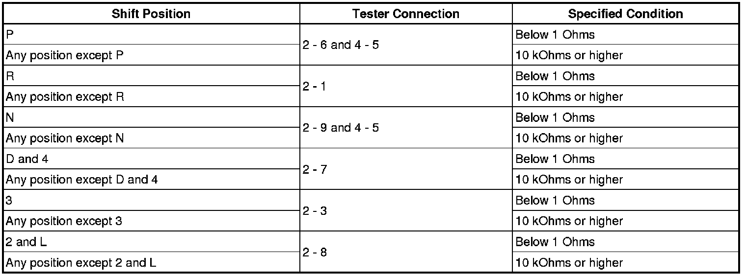 Measure the resistance according to the value(s) in the table below when the shift lever is moved to each position.