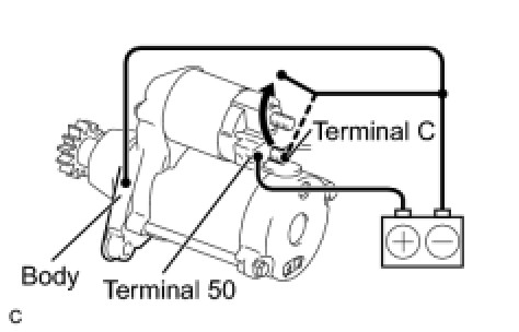 (1) Disconnect the negative (-) terminal lead from terminal C under the conditions for pull-in test. Check that the pinion gear remains out.