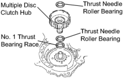 (a) Remove the 2 thrust needle roller bearings, multiple disc clutch hub, and No. 1 thrust bearing race.