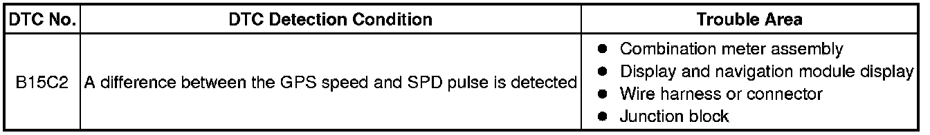 The display and navigation module display stores this DTC when the difference between the speed information that the navigation antenna receives and the SPD pulse received from the combination meter assembly becomes large.