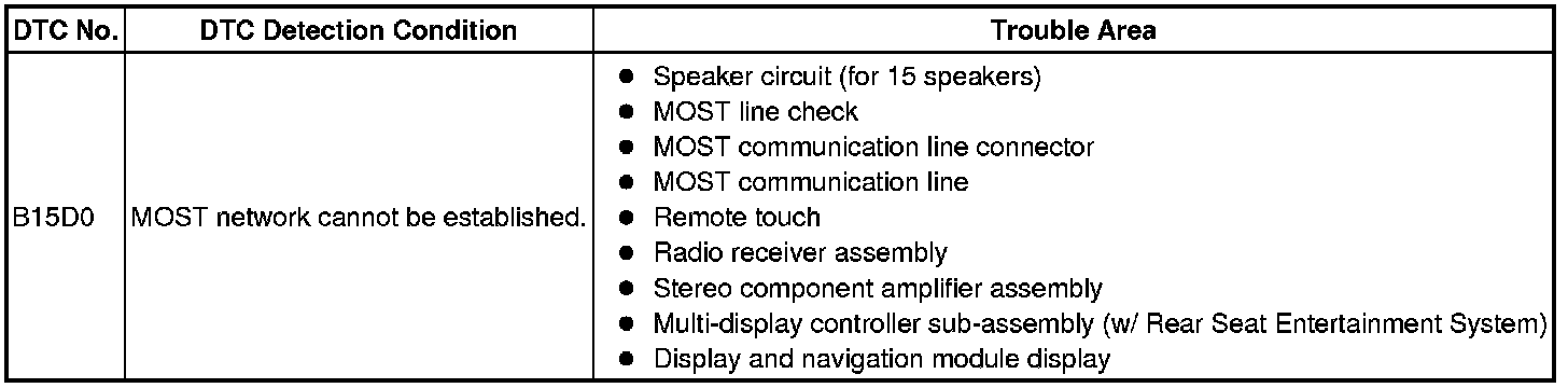 * When the stereo component amplifier assembly stops operating and a malfunction occurs in the navigation system due to a short in a speaker circuit, this DTC will be stored. (for 15 speakers)