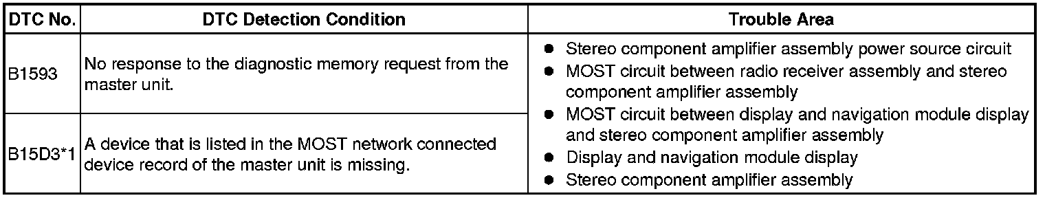 When a MOST communication error occurs between the display and navigation module display and stereo component amplifier assembly, these DTCs will be stored.