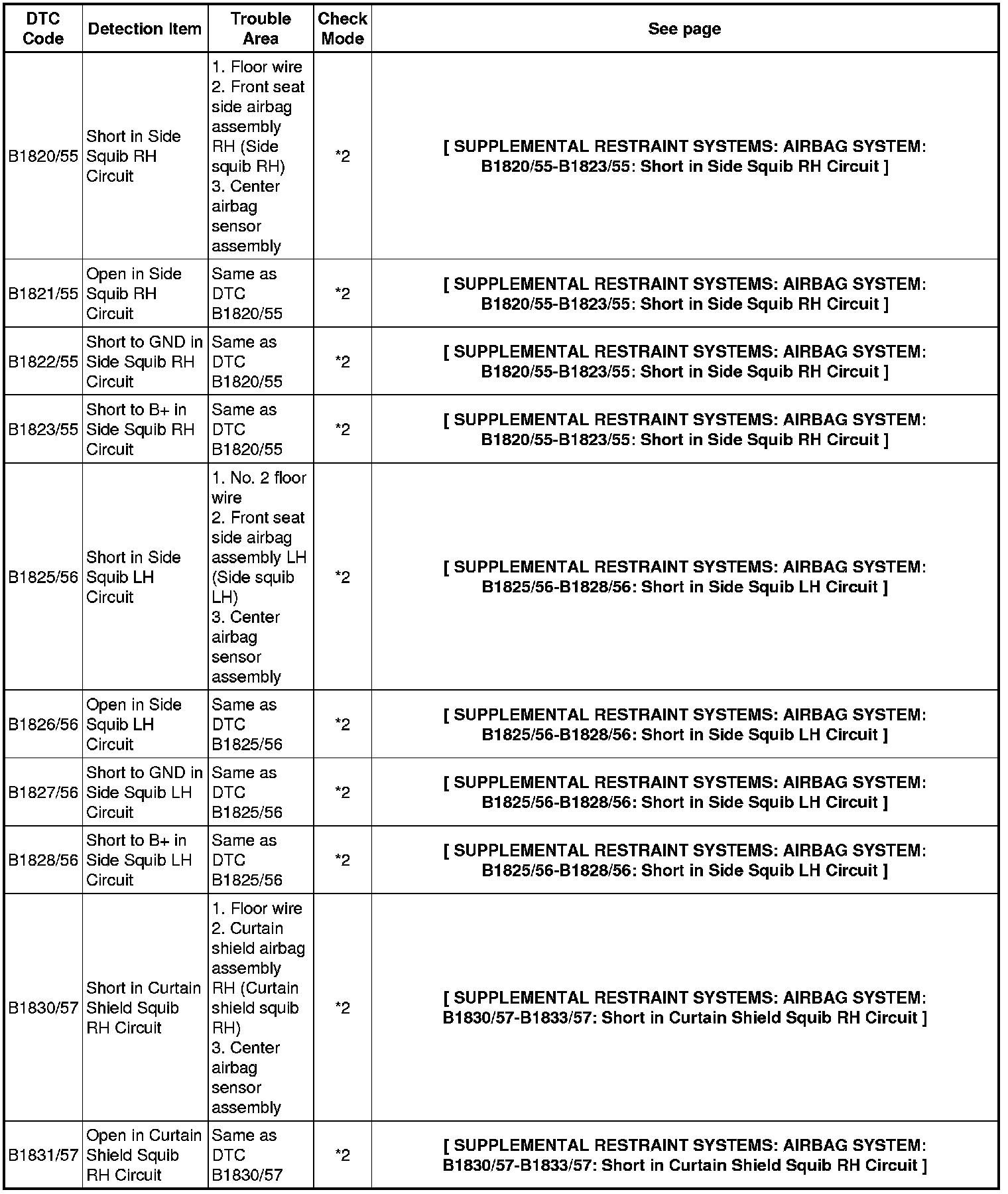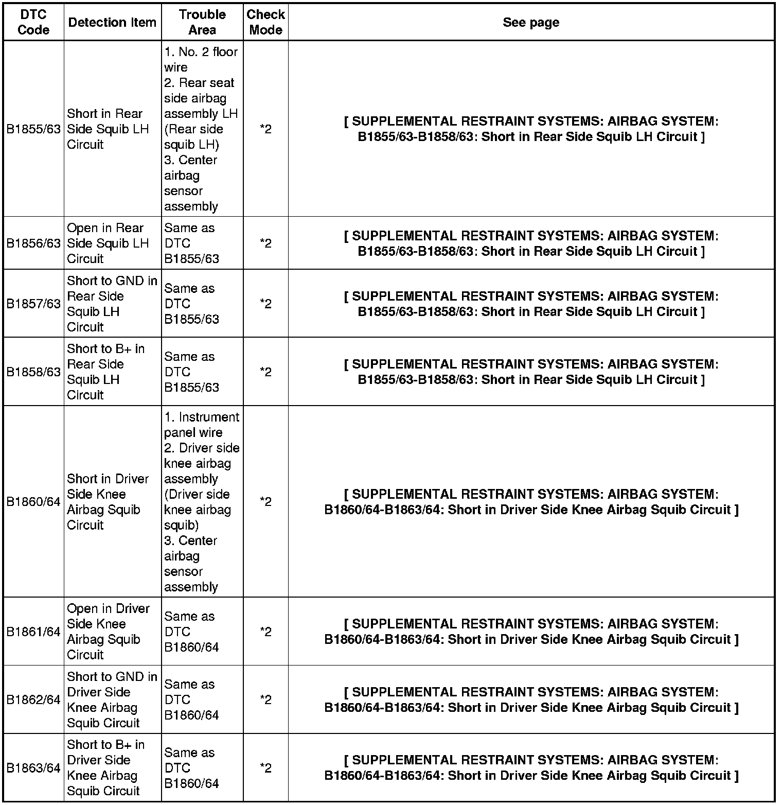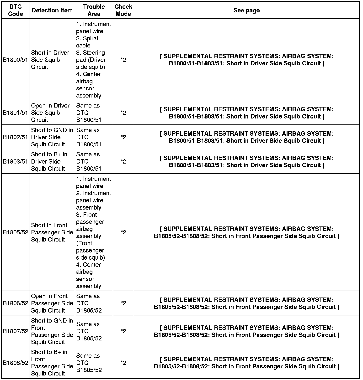 * In the case of any malfunction concerning an open circuit, short to ground, or short to B+ due to a squib, other trouble codes may not be detected. In this case, repair the malfunction currently indicated and then perform malfunction diagnosis again.