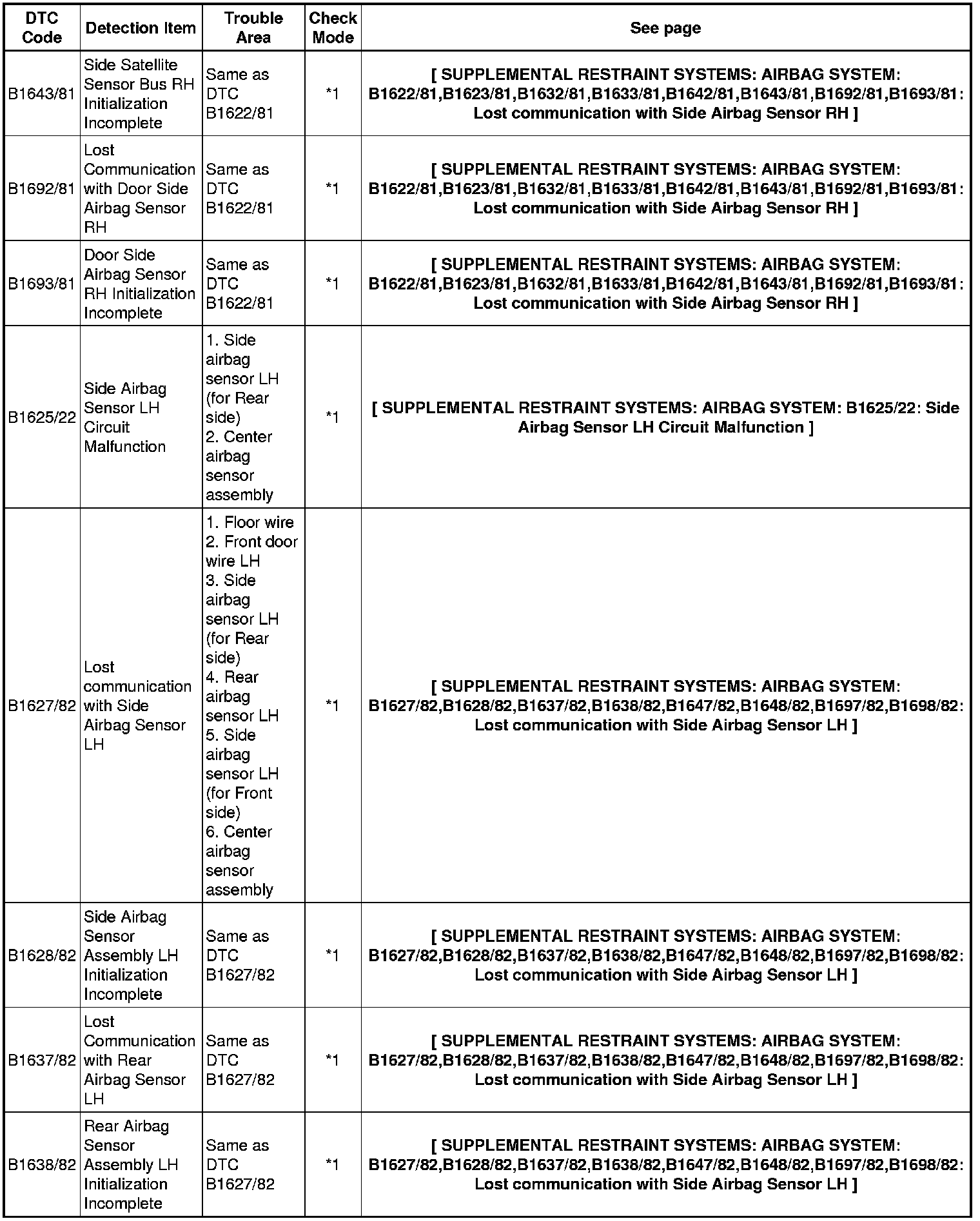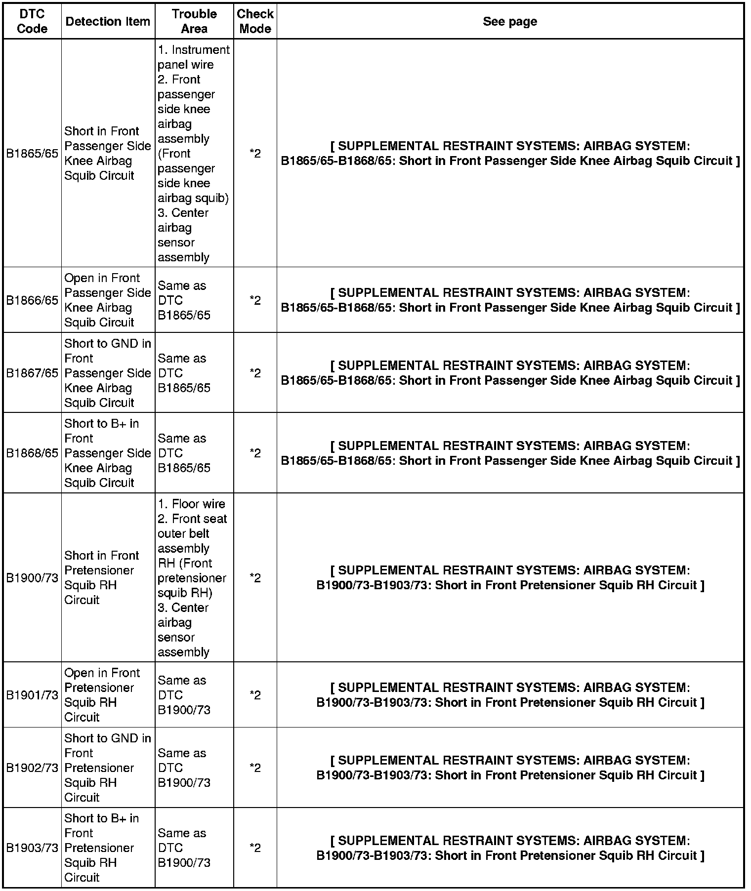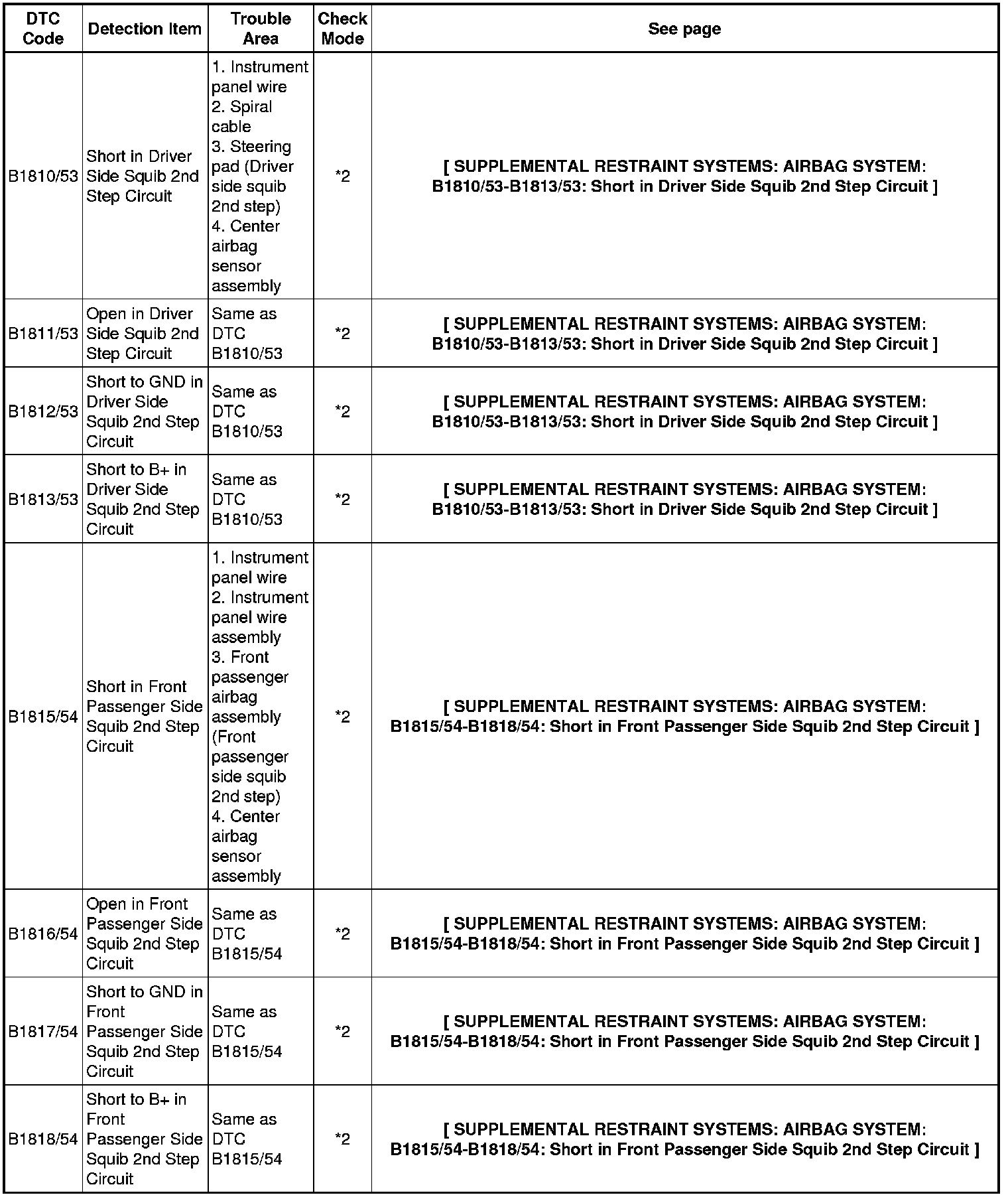 * In the case of any malfunction concerning an open circuit, short to ground, or short to B+ due to a squib, other trouble codes may not be detected. In this case, repair the malfunction currently indicated and then perform malfunction diagnosis again.