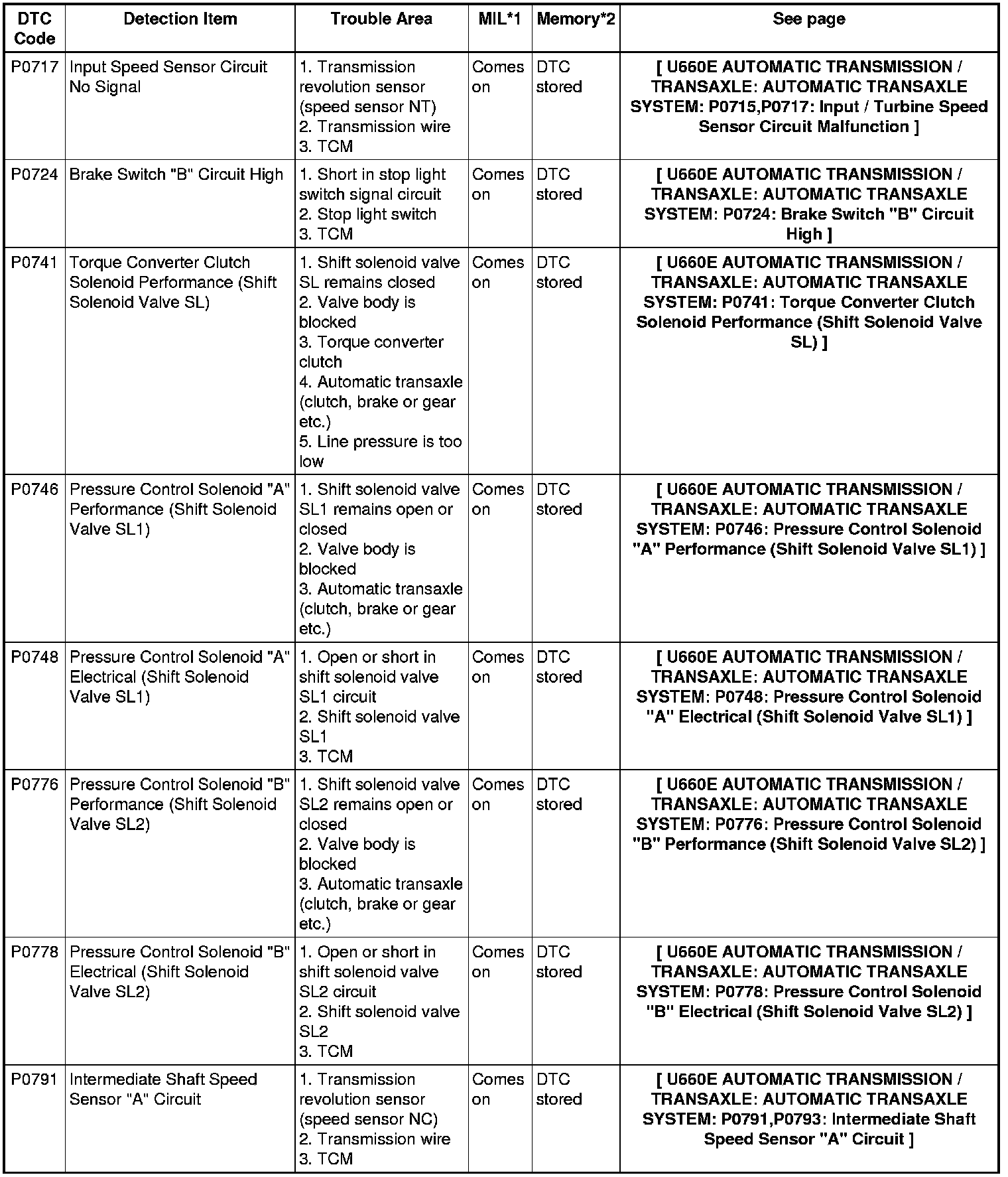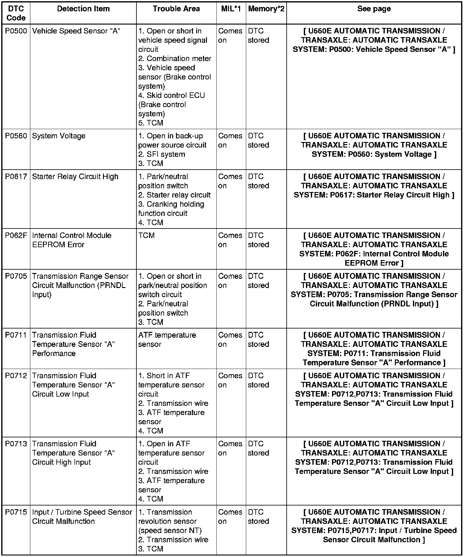 U660E AUTOMATIC TRANSMISSION / TRANSAXLE: AUTOMATIC TRANSAXLE SYSTEM: DIAGNOSTIC TROUBLE CODE CHART