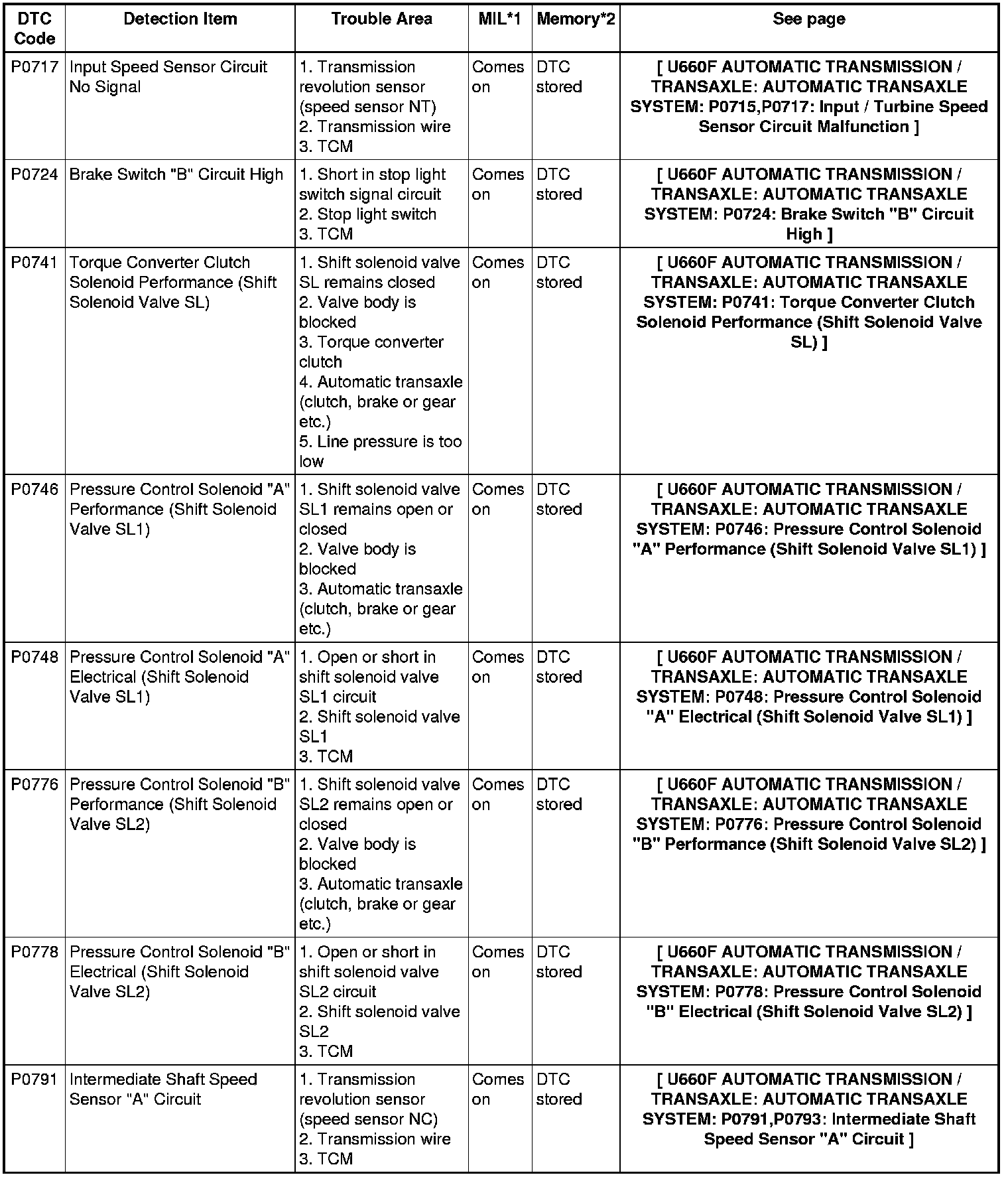 U660F AUTOMATIC TRANSMISSION / TRANSAXLE: AUTOMATIC TRANSAXLE SYSTEM: DIAGNOSTIC TROUBLE CODE CHART
