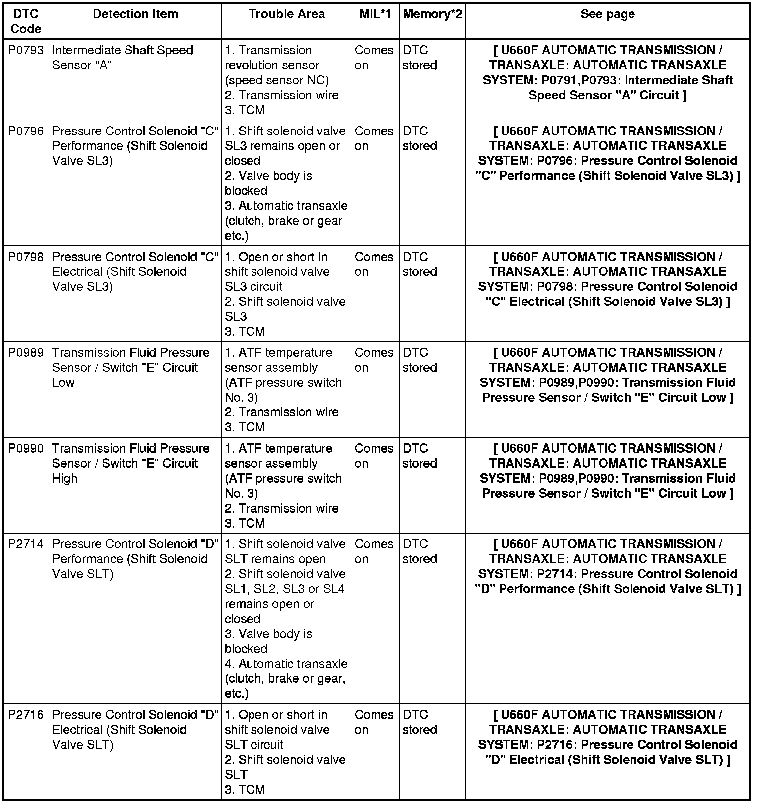 * *2: "DTC stored" means the TCM memorizes the trouble code if the TCM detects the DTC detection condition.