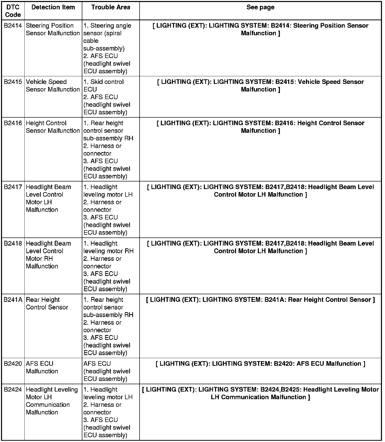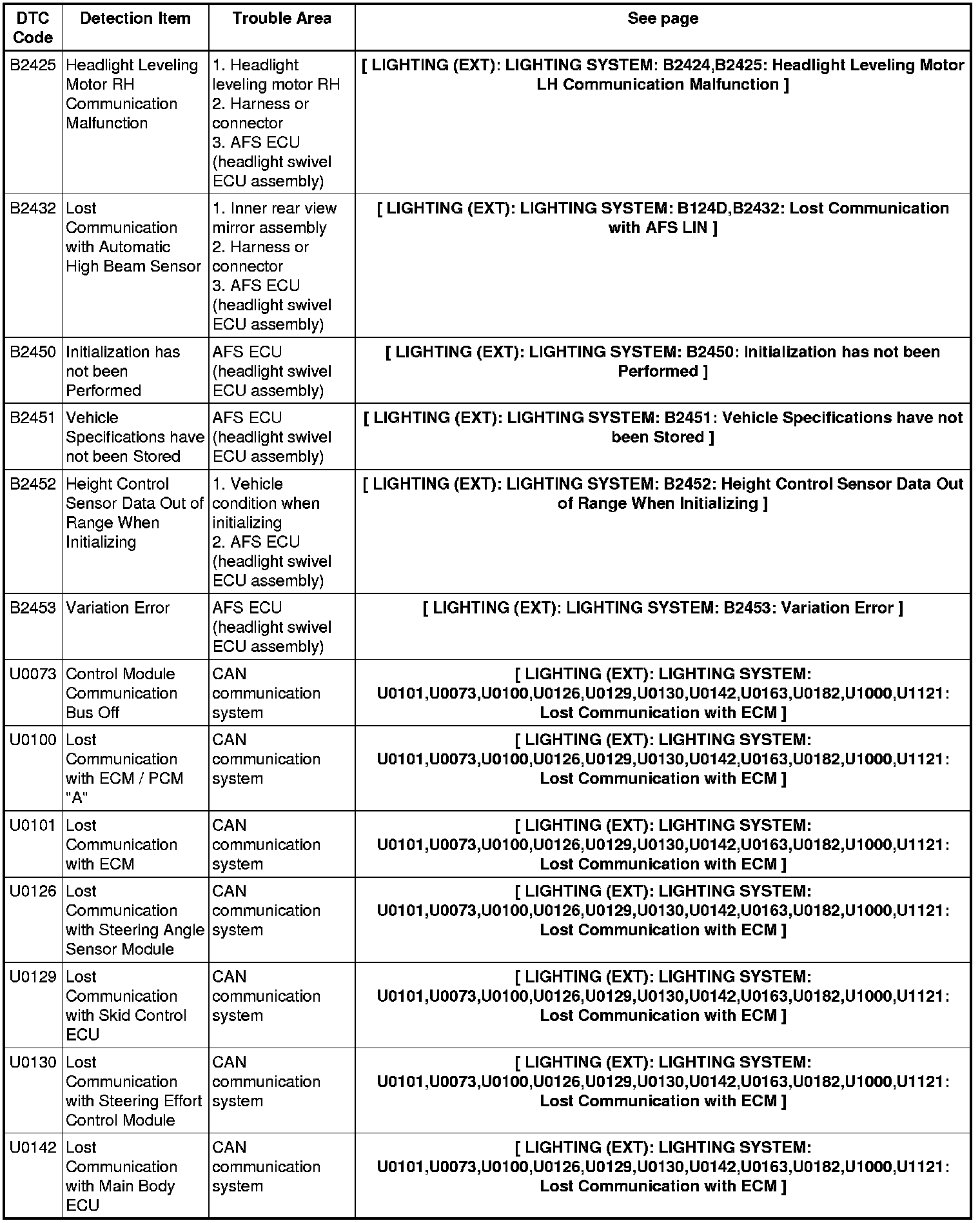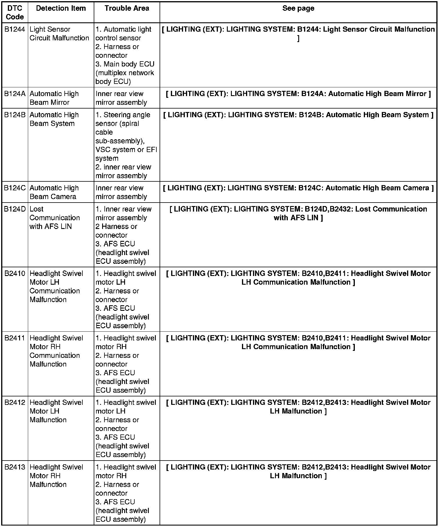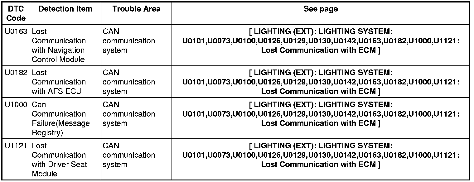 LIGHTING (EXT): LIGHTING SYSTEM: DIAGNOSTIC TROUBLE CODE CHART