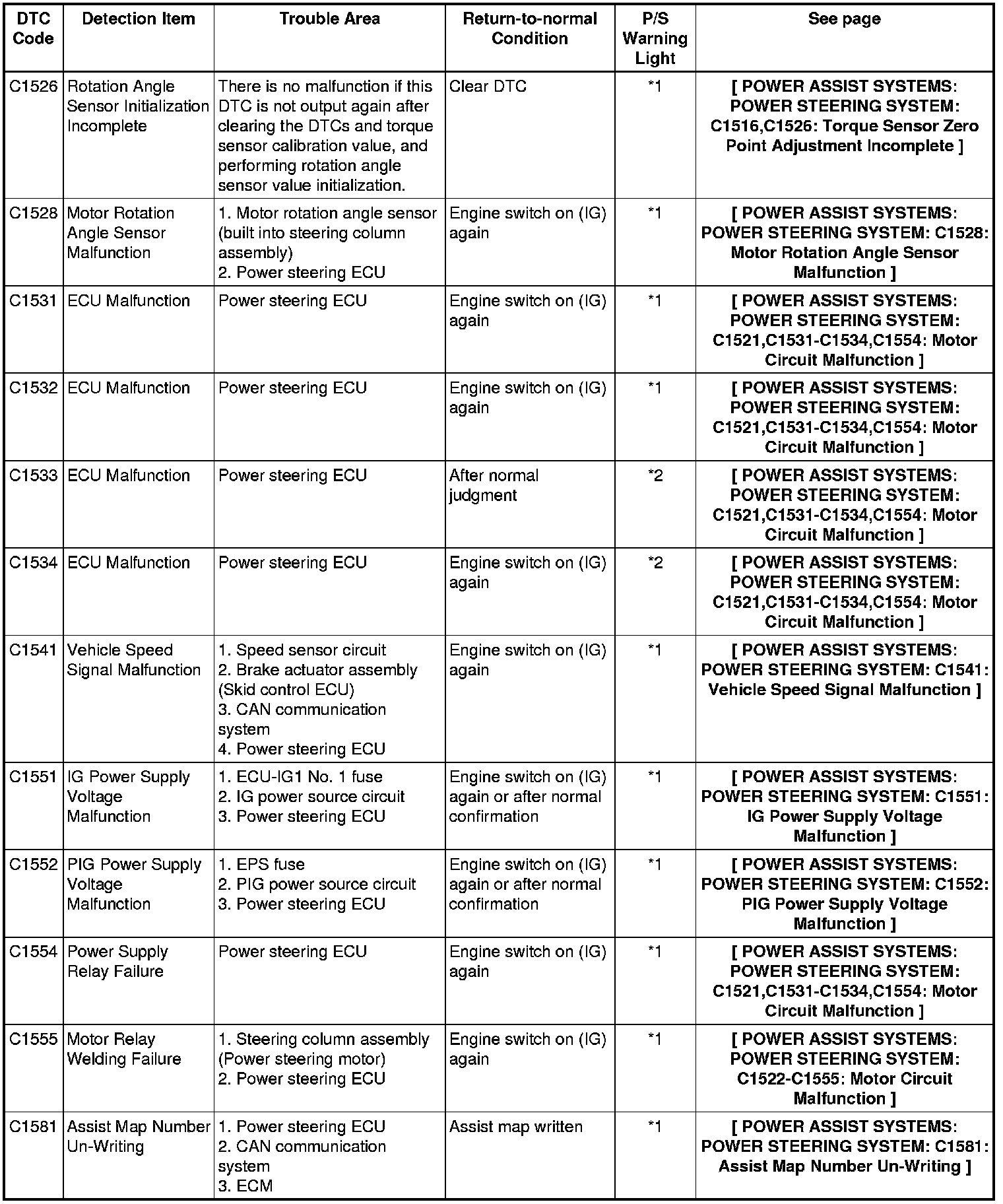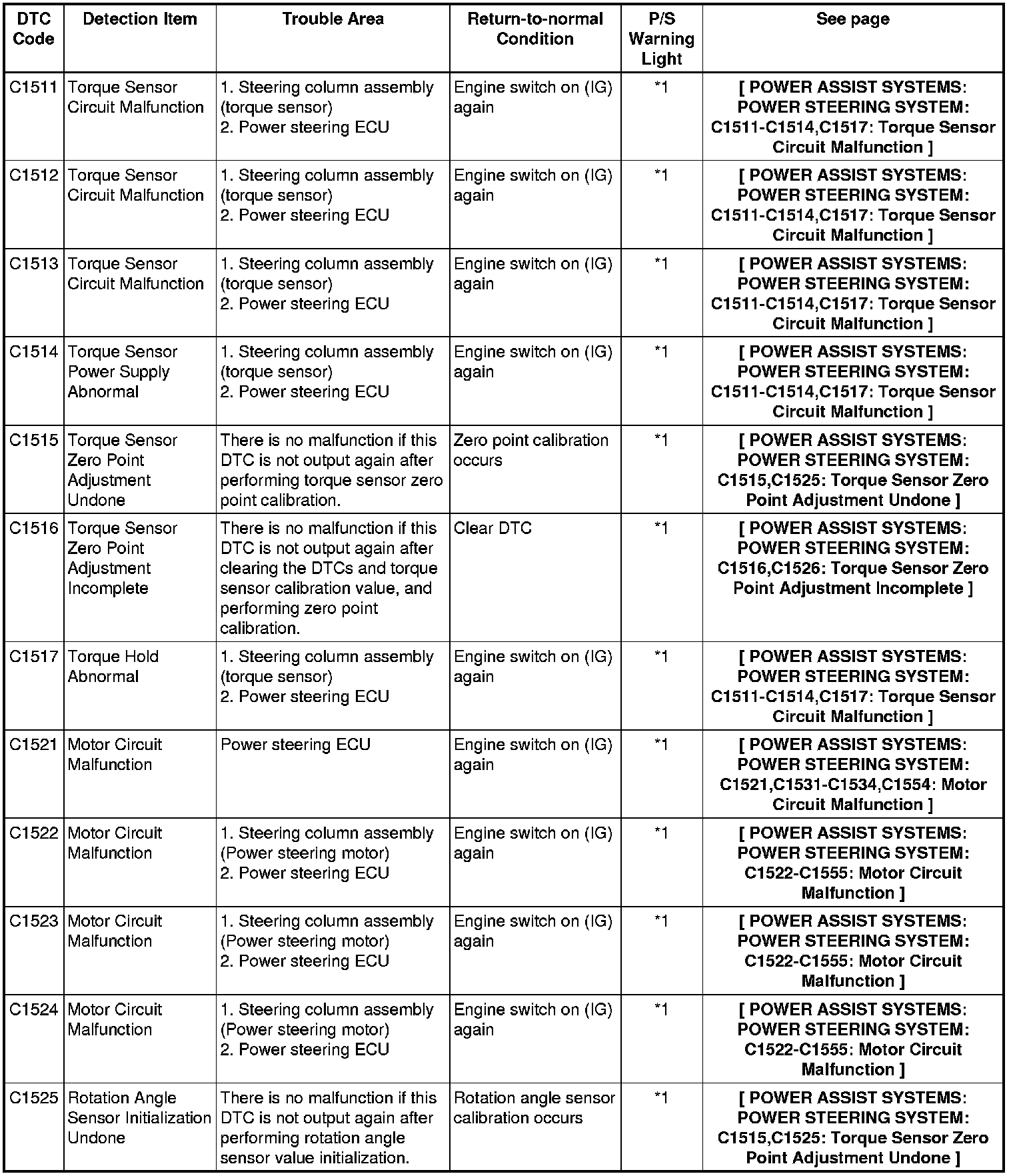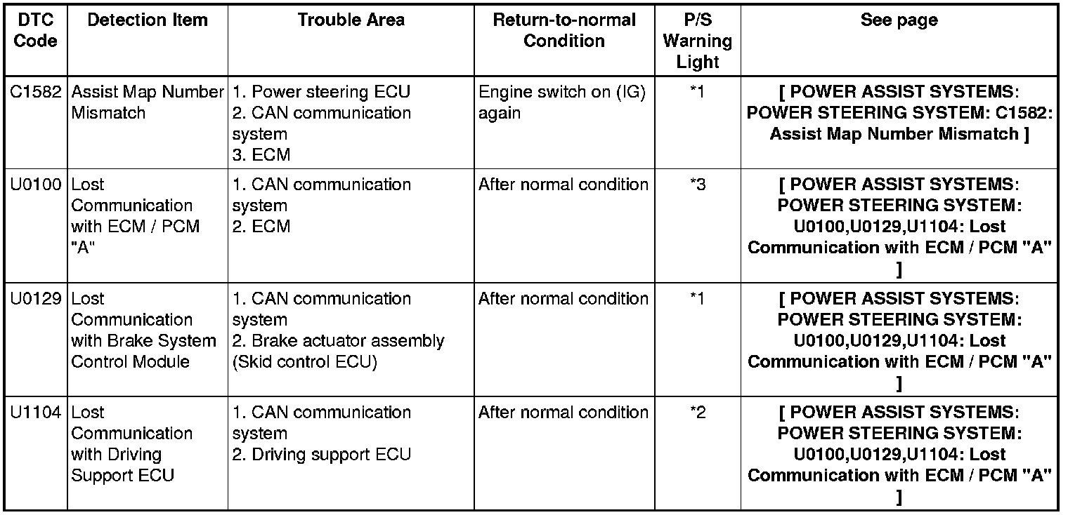 POWER ASSIST SYSTEMS: POWER STEERING SYSTEM: DIAGNOSTIC TROUBLE CODE CHART