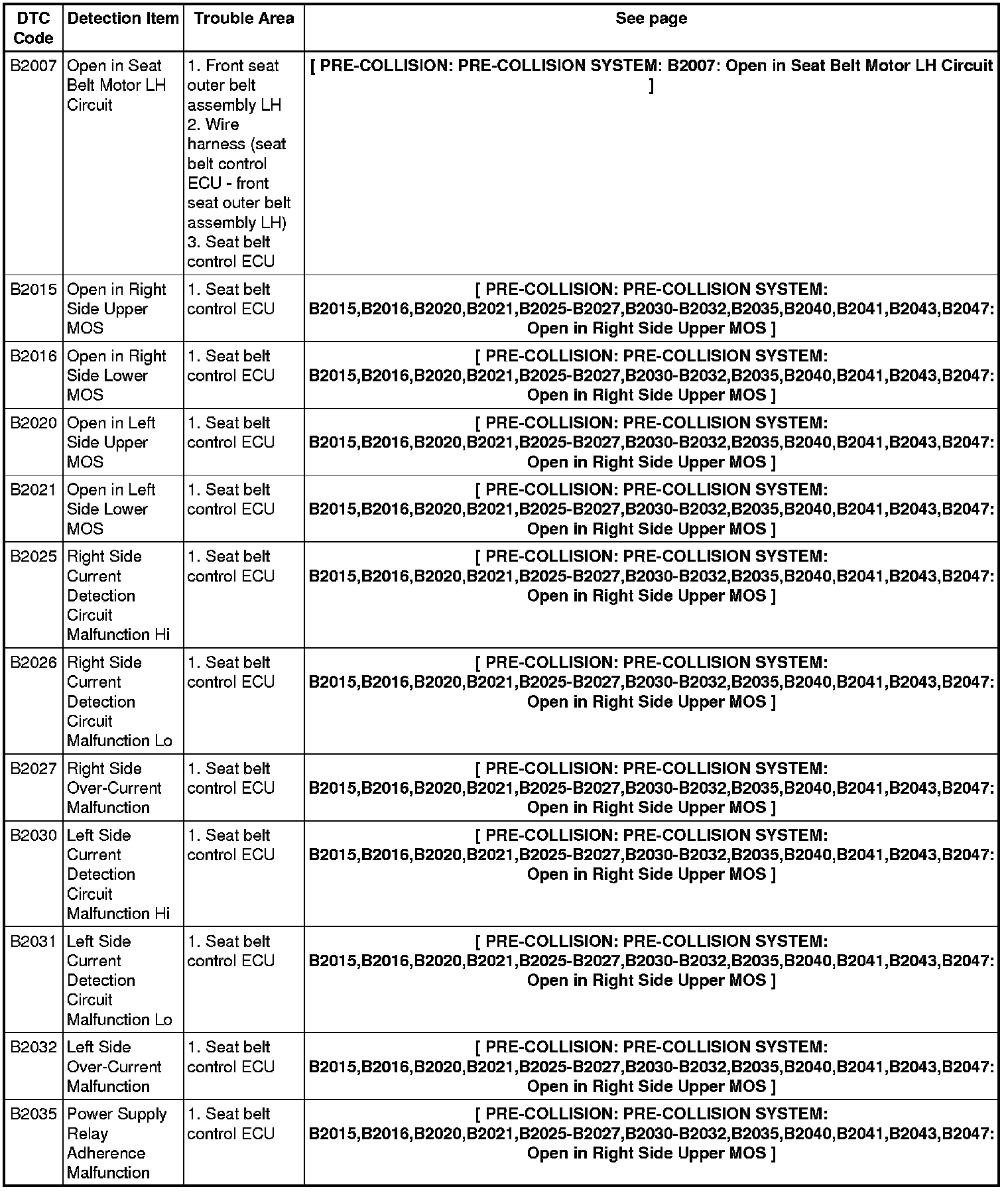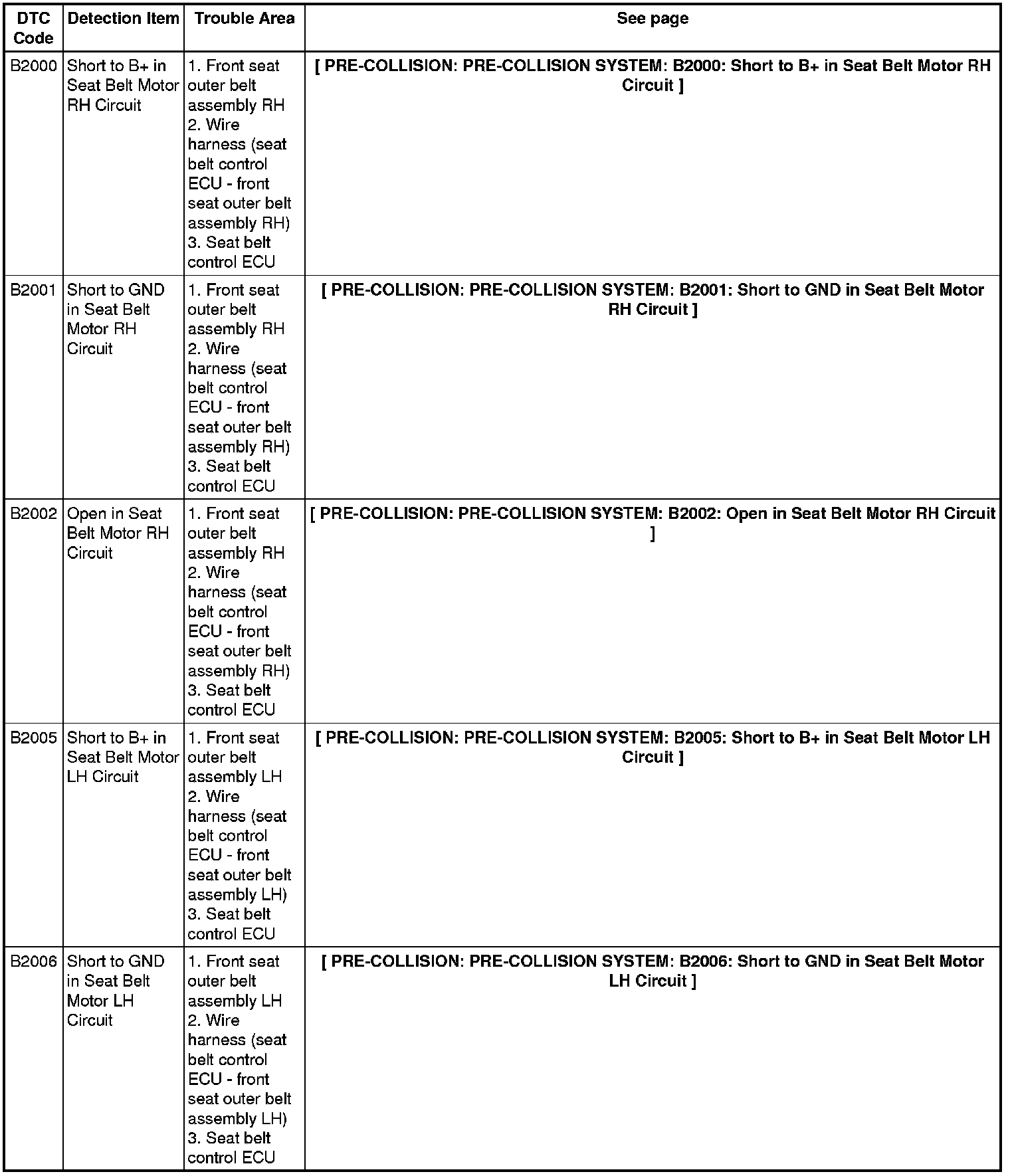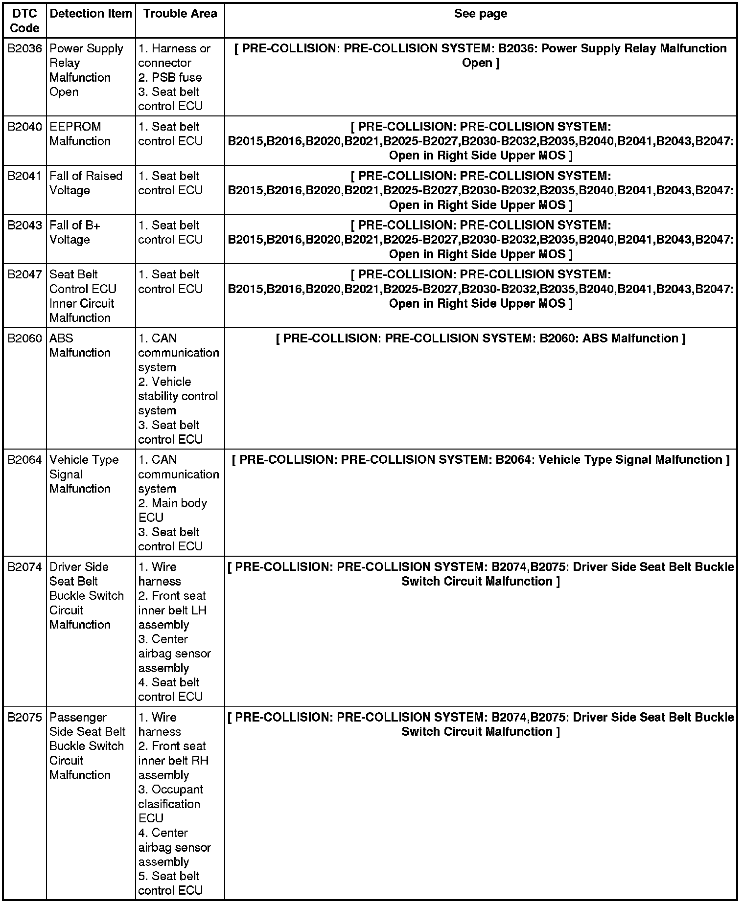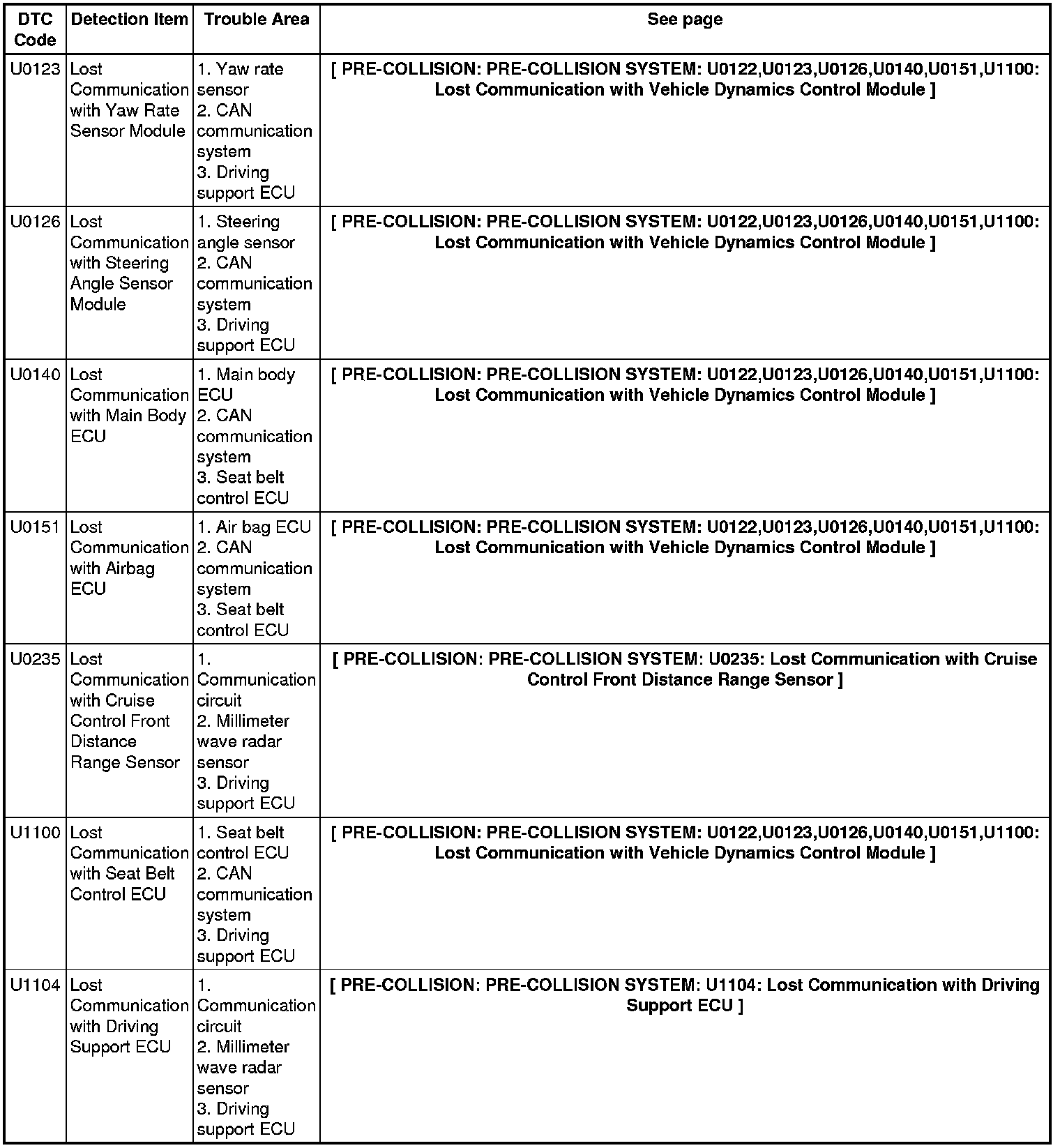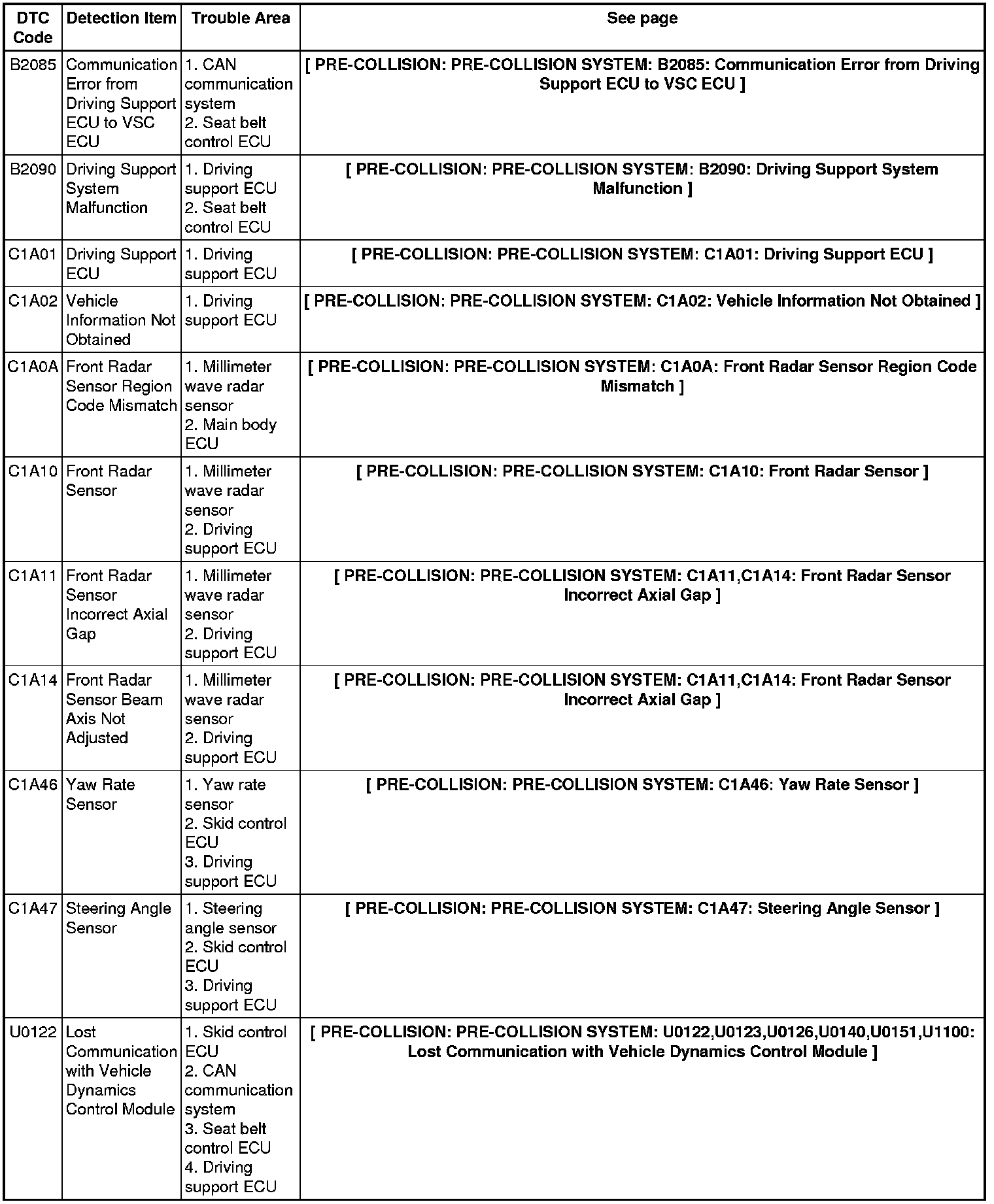 PRE-COLLISION: PRE-COLLISION SYSTEM: DIAGNOSTIC TROUBLE CODE CHART