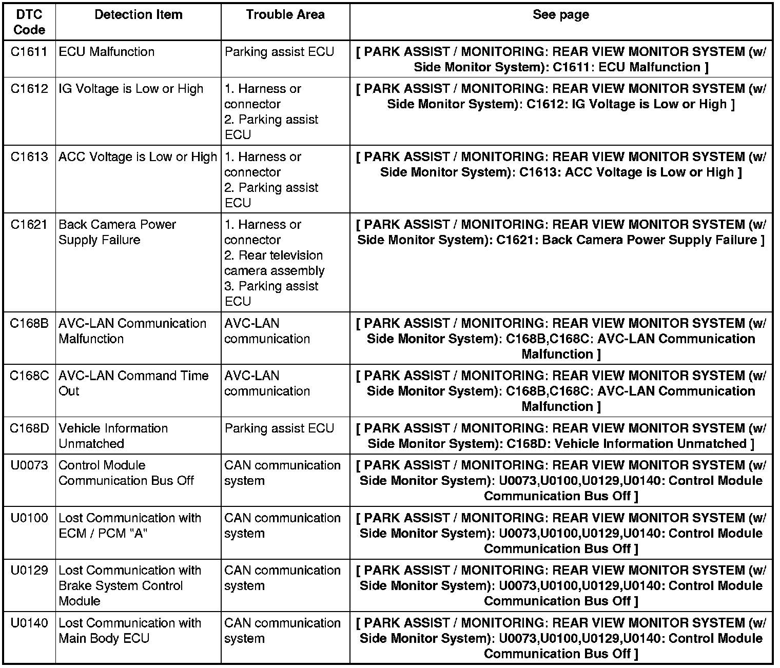 PARK ASSIST / MONITORING: REAR VIEW MONITOR SYSTEM (w/ Side Monitor System): DIAGNOSTIC TROUBLE CODE CHART