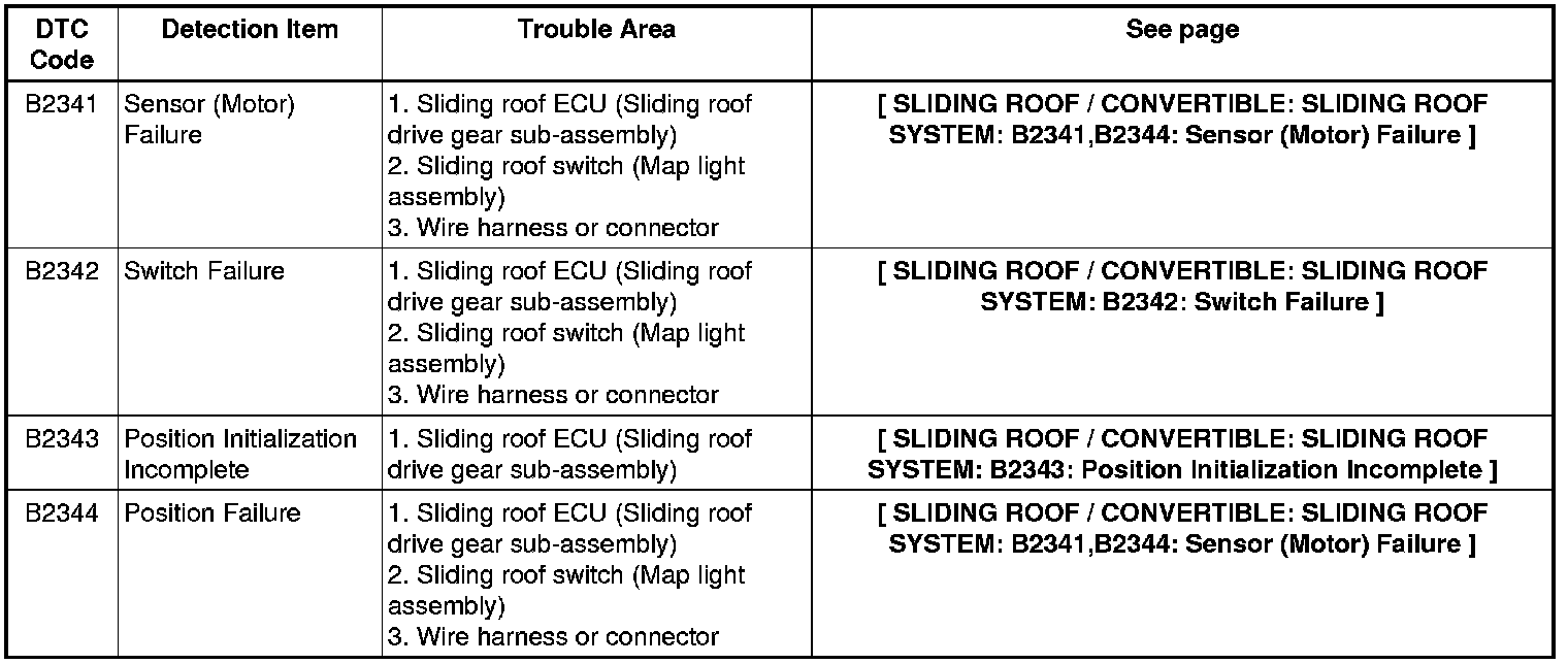 SLIDING ROOF / CONVERTIBLE: SLIDING ROOF SYSTEM: DIAGNOSTIC TROUBLE CODE CHART