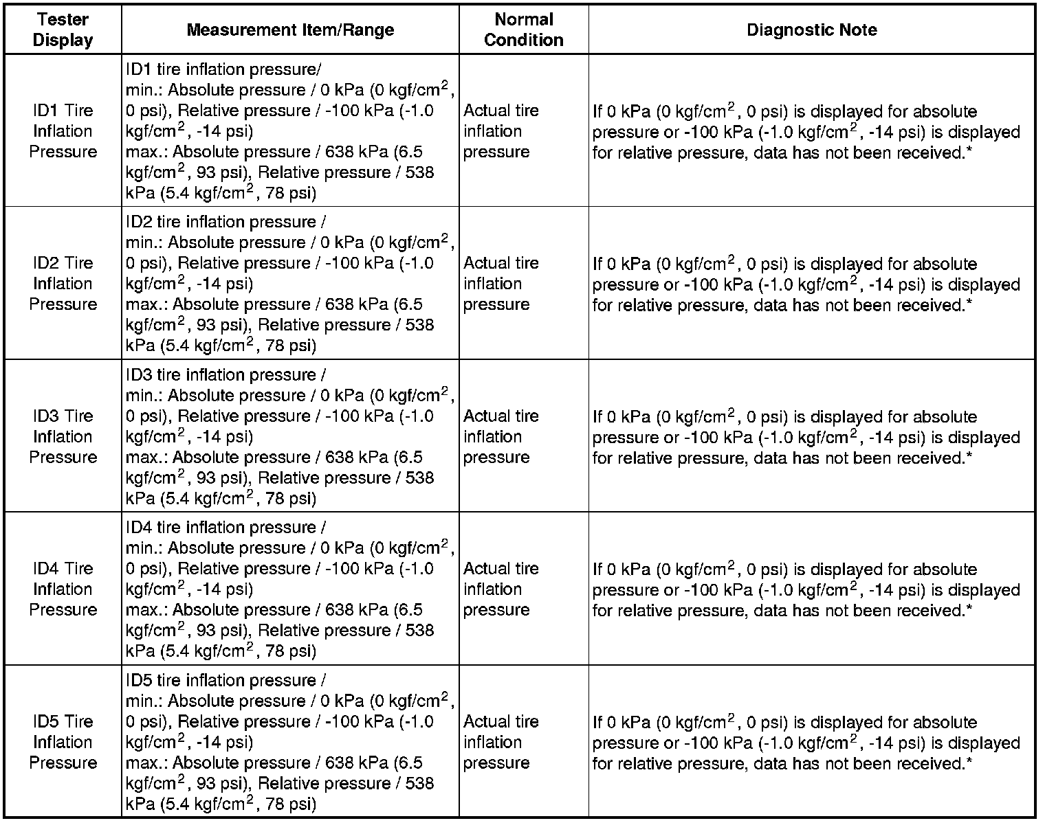 * Record which "ID Tire Inflation Pressure" data (ID1 to ID5) corresponds to which tire.