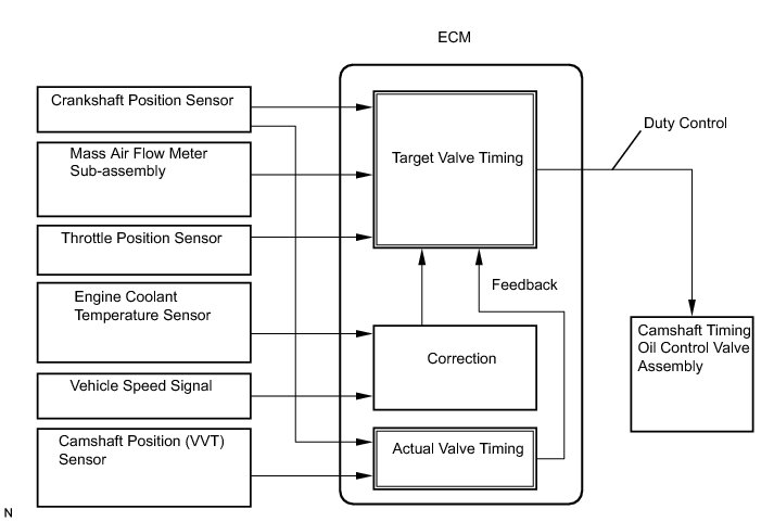 The Variable Valve Timing (VVT) system includes the ECM, camshaft timing oil control valve assembly and VVT controller. The ECM sends a target duty-cycle control signal to the camshaft timing oil control valve assembly. This control signal regulates the oil pressure supplied to the VVT controller. Camshaft timing control is performed according to engine operating conditions such as intake air volume, throttle valve position and engine coolant temperature. The ECM controls the camshaft timing oil control valve assembly, based on the signals transmitted from several sensors. The VVT controller regulates the intake camshaft angle using oil pressure through the camshaft timing oil control valve assembly. As a result, the relative positions of the camshaft and crankshaft are optimized, the engine torque and fuel economy improve, and the exhaust emissions decrease under overall driving conditions. The ECM detects the actual intake valve timing using signals from the camshaft and crankshaft position sensors, and performs feedback control. This is how the target intake valve timing is verified by the ECM.