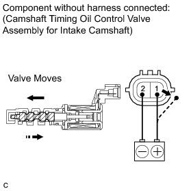 (c) Connect the positive (+) battery terminal to terminal 1 and connect the negative (-) battery terminal to terminal 2. Check the valve operation.