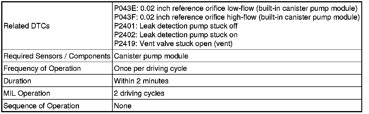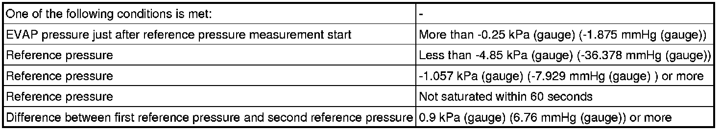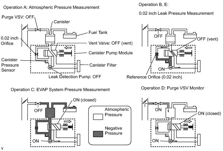 The leak detection pump creates negative pressure through the reference orifice. When the system is normal, the EVAP pressure is in 724 to 752 mmHg (abs)* and saturated within a minute.