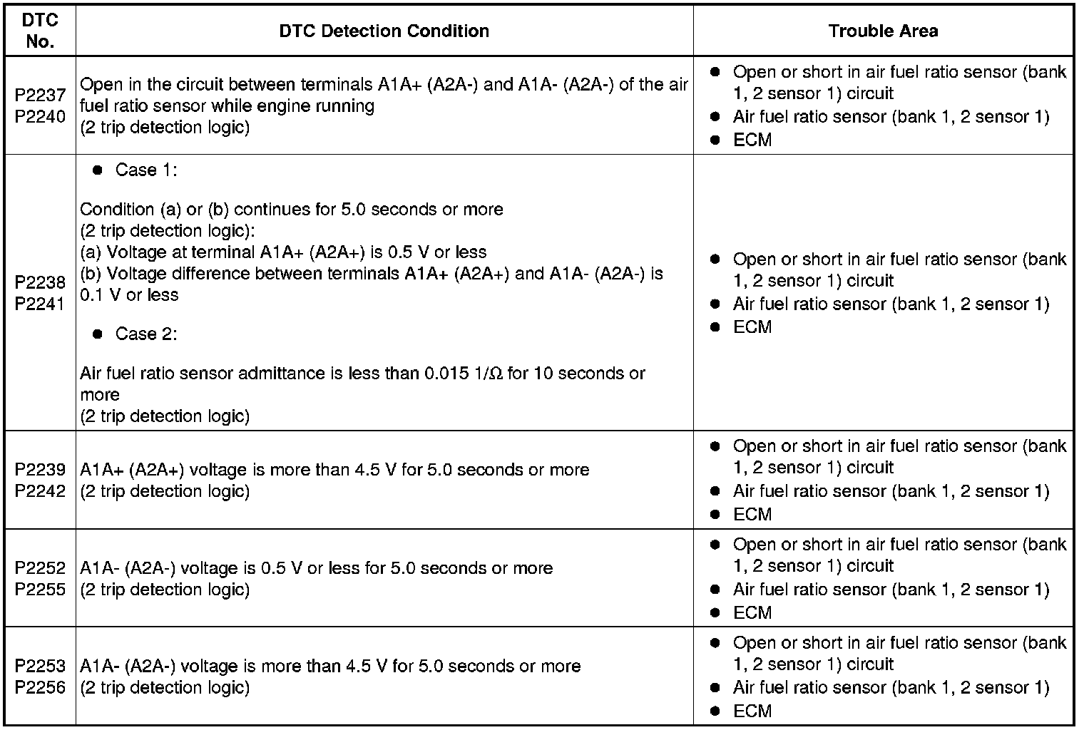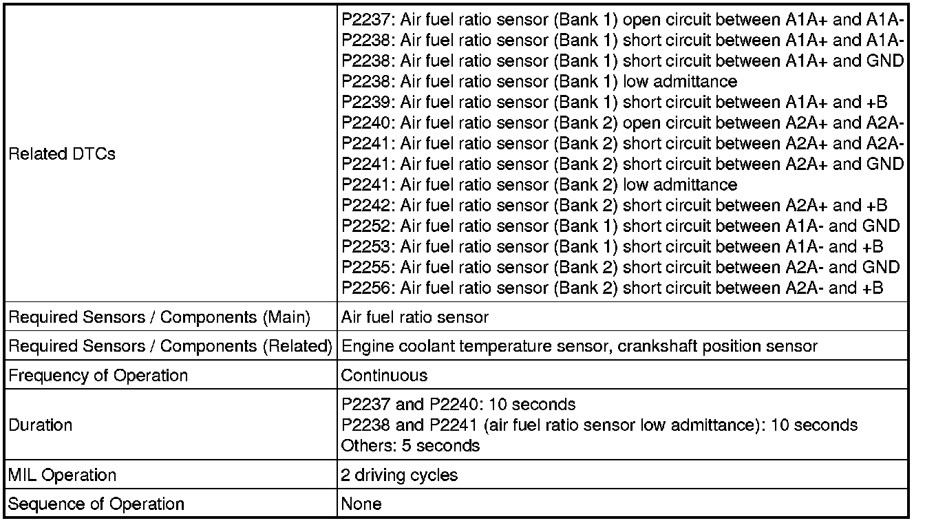 - DTCs P2237, P2238, P2239, P2252 and P2253 indicate malfunctions related to the bank 1 air fuel ratio sensor circuit.