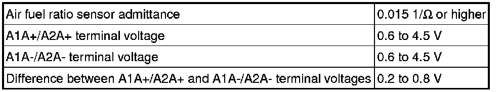 To detect these problems, the voltage of the air fuel ratio sensor is monitored when turning the engine switch on (IG), and the admittance (admittance is an electrical term that indicates the ease of flow of current) is checked while driving. If the voltage of the air fuel ratio sensor is between 0.6 V and 4.5 V, it is considered normal. If the voltage is outside of the specified range, or the admittance is below the standard value, the ECM will determine that there is a malfunction in the air fuel ratio sensor. If the same malfunction is detected in the next driving cycle, the MIL is illuminated and a DTC is stored.