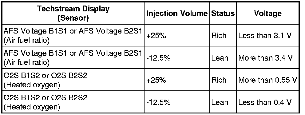 Malfunctioning areas can be identified by performing the Control the Injection Volume for A/F Sensor in the Active Test. The Control the Injection Volume for A/F Sensor function can help to determine whether the air fuel ratio sensor, heated oxygen sensor and other potential trouble areas are malfunctioning.