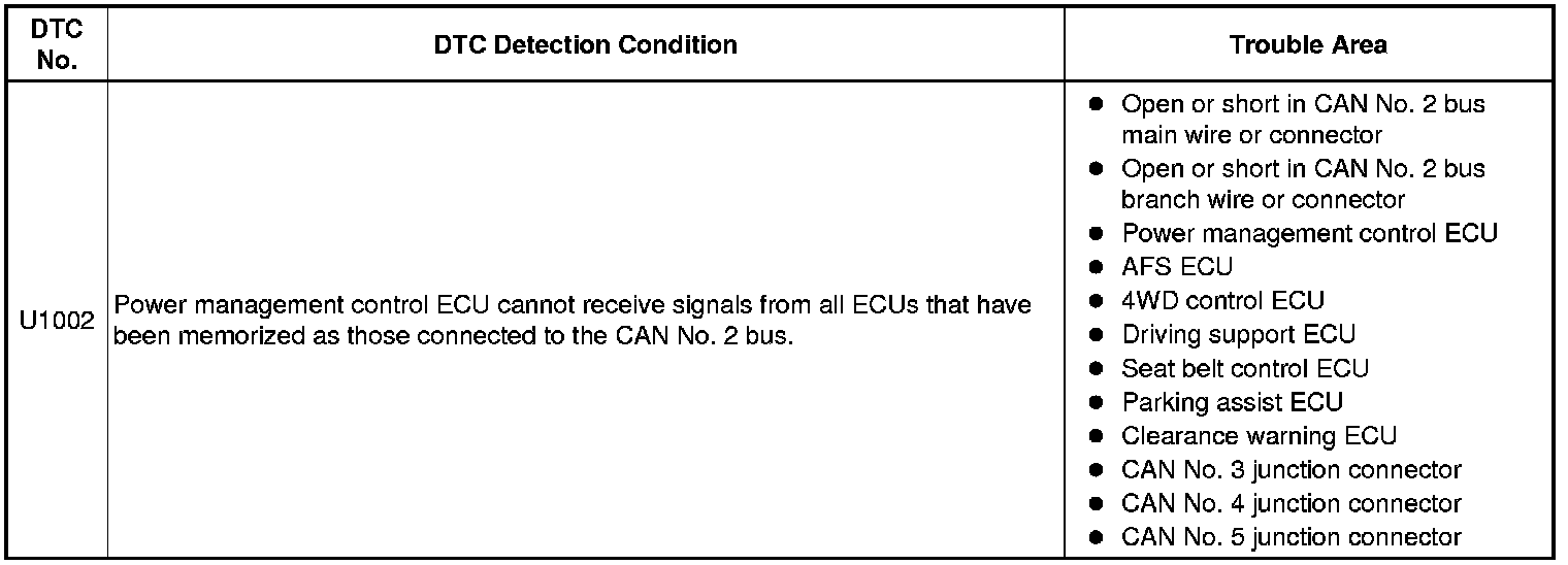 * The power management control ECU will store this DTC when no signals can be received from the ECUs that have been memorized as those that are connected to the CAN No. 2 bus.