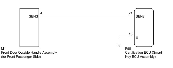 If the front passenger door entry lock function operates normally, but its entry unlock function does not, this means that the request code from the front passenger door is being output normally. In this case, a malfunction in the touch sensor circuit (from the certification ECU (smart key ECU assembly) to the front door outside handle assembly (touch sensor)) is suspected.