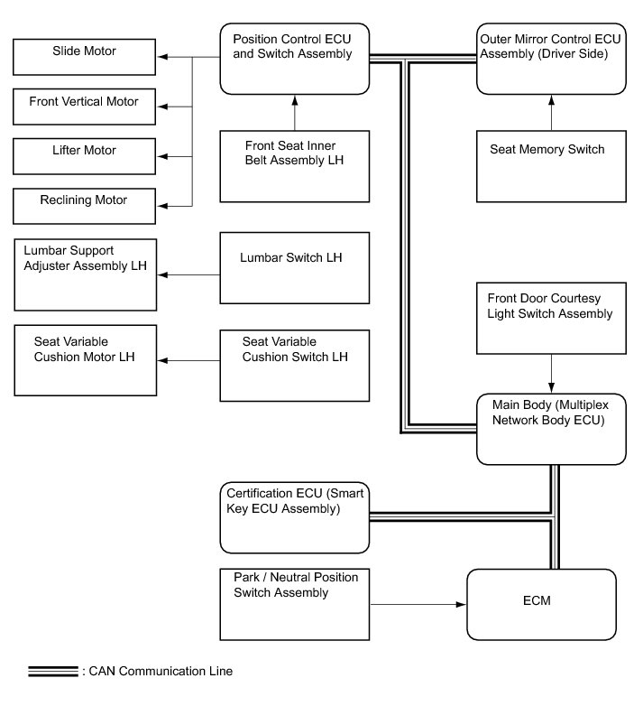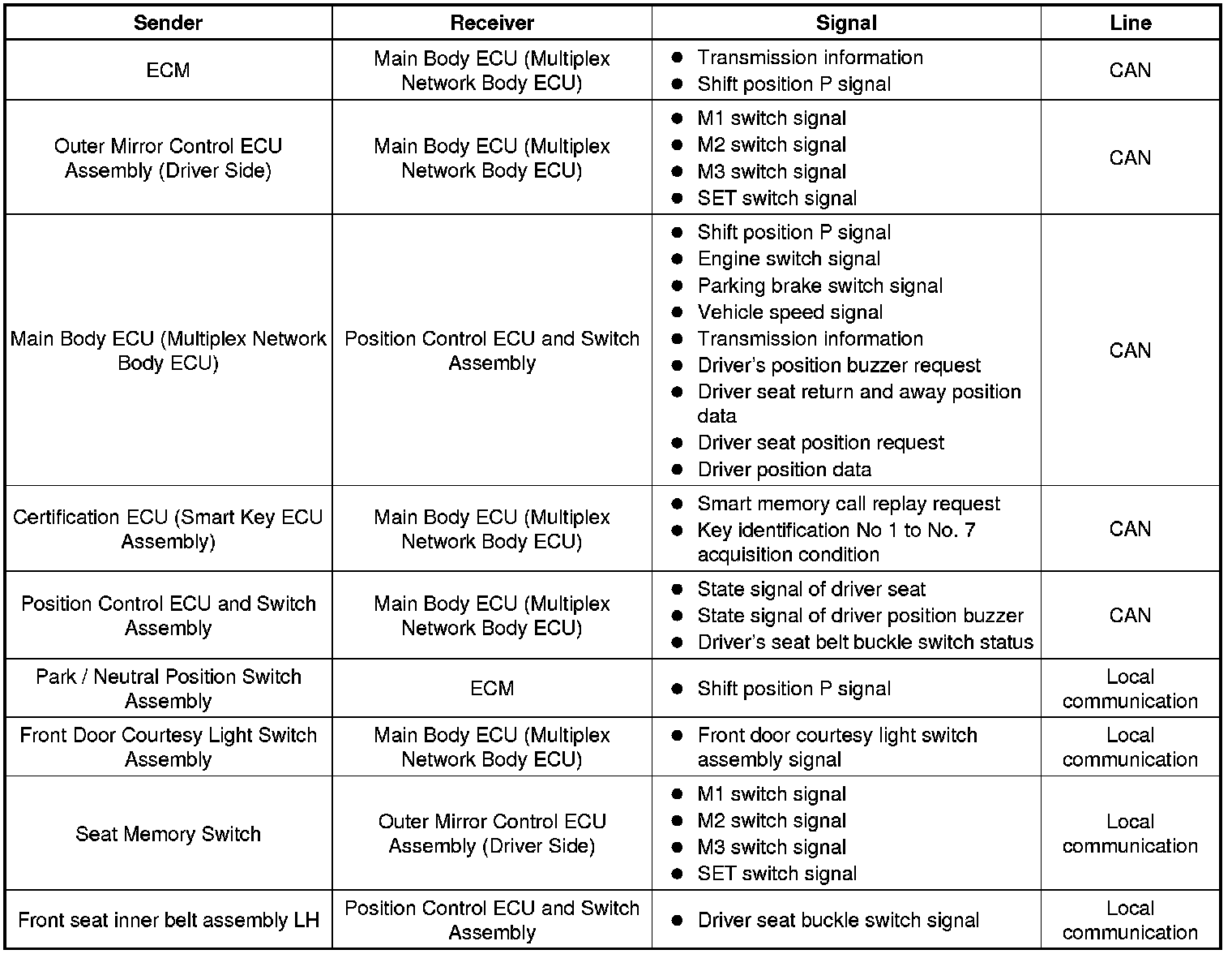 The seat memory switch sends memory switch information to the outer mirror control ECU assembly (driver side). Then the information is sent to the main body ECU (multiplex network body ECU) via CAN. The information is received by the main body ECU (multiplex network body ECU) and an instruction to memorize the seat position is sent to the position control ECU and switch assembly via CAN. As a result, the seat position is memorized.