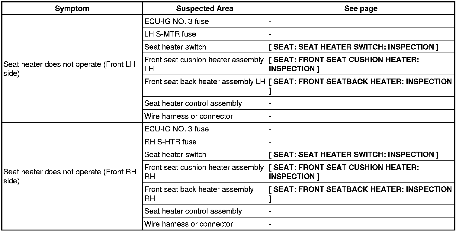 SEAT: SEAT HEATER SYSTEM: PROBLEM SYMPTOMS TABLE