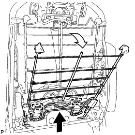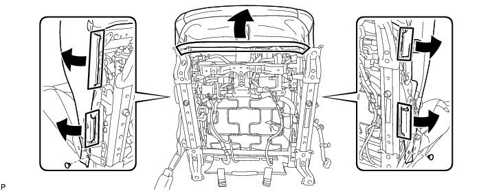 (a) Disengage the 2 hooks and remove the 2 rubber bands of the front seatback board from the front seat frame.