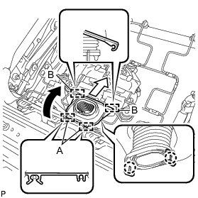 (b) Disengage the 2 clamps (B) in the direction indicated by the arrow.